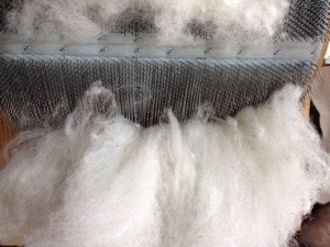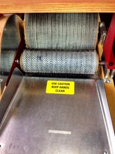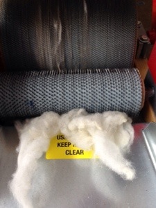 Then I ran the fibers through the drum carder. A drum carder consists of two cylinders.