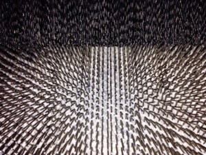 And here it is on the loom woven into a fabric. I deliberately chose a weaving pattern that shows off the hand spun yarn instead of the commercial thread I used for the warp.