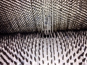 The smaller cylinder is covered with little blades that helps to separate the fibers.