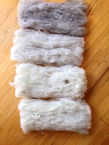 I ran the medium gray wool through together, then the light grey, and then the whiter wool resulting in four batts.