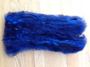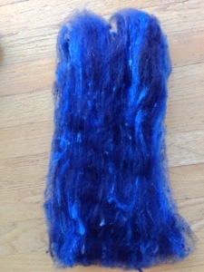 Then I died the wool various shades of blue, rinsed it, ran it through the spin cycle of the washing machine again, let it air dry and then blended the various colors together using the drum carder, resulting in this: