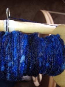 Single ply yarn. The little lumps are there because the rambouillet came out of the carder with little lumps in it. I like them so I spun them into the yarn. I want the fabric I make to have a lot of texture.